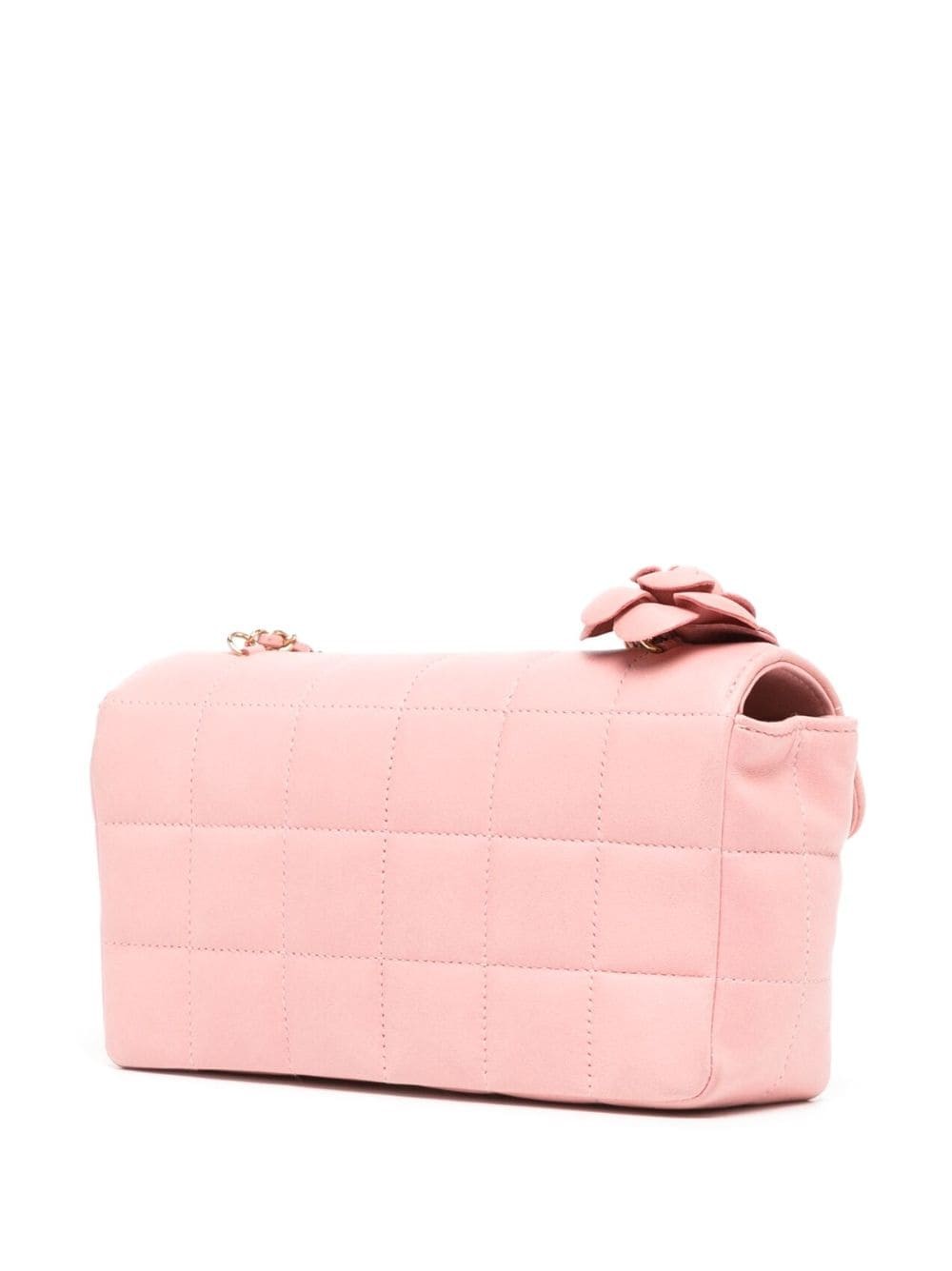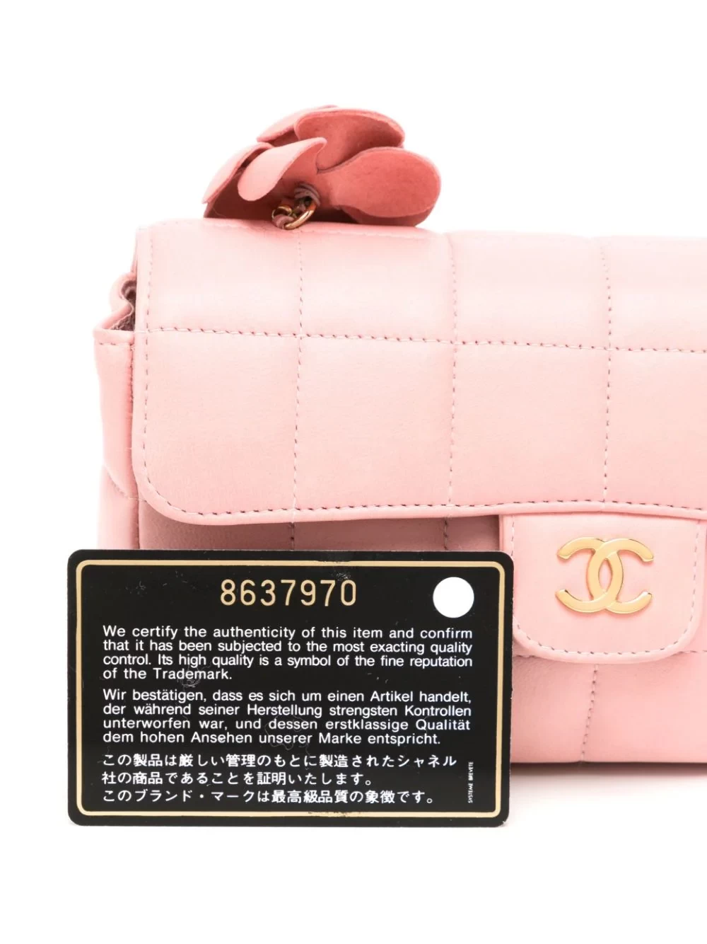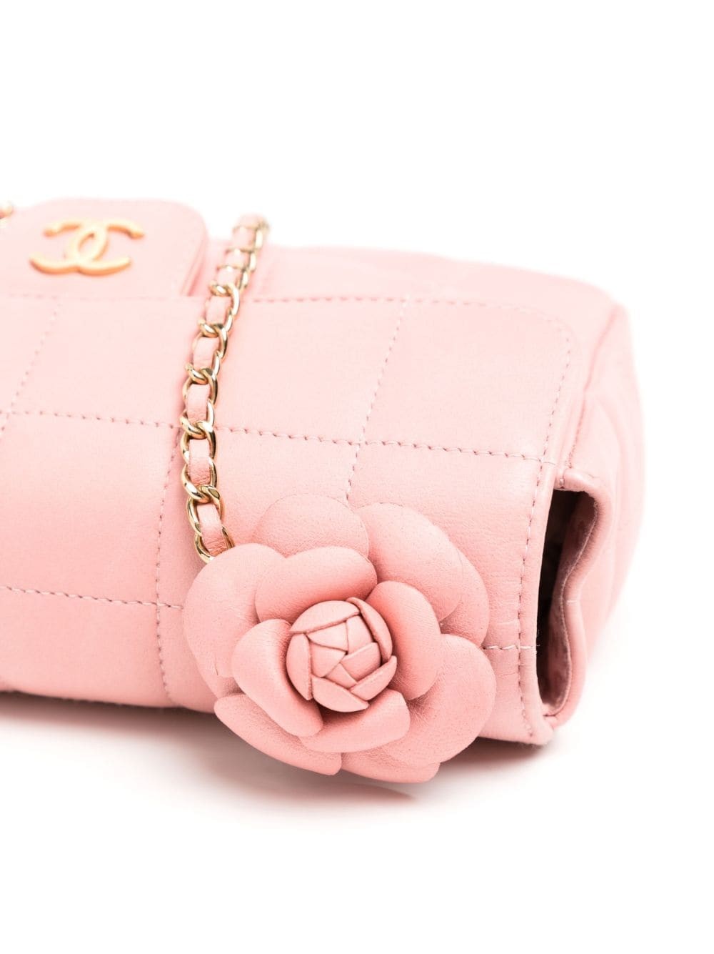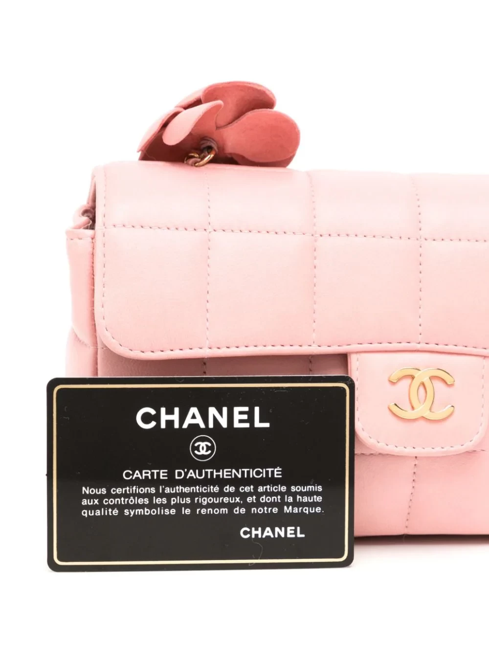 Light pink, lambskin, iconic Choco Bar quilting, iconic camellia design, iconic buckle CC logo, leather chain shoulder straps, flip decorated with magnetic buckle, main interlayer, built-in pocket, built-in logo decal, gold hardware accessories.